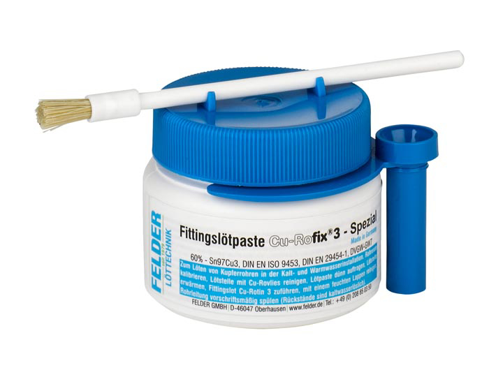 Pasta za meki lem FELDER Cu-Rofix® 3-Spezial pakovanja 250 g namenjena je za pretinovanje i meko lemljenje bakarnih cevi i fitinga u vodovodnim instalacijama hladne i tople vode. Pasta je gotova za upotrebu i koristi se u kombinaciji sa lem legurom Cu-Rotin® 3 (Sn97Cu3).