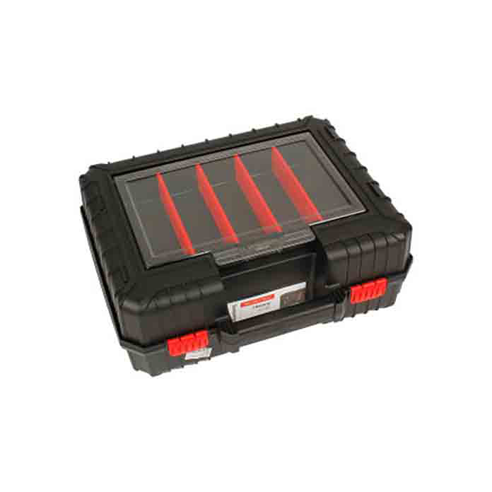 Plastični HD kofer za alat dimenzija 384 x 335 x 144 mm namenjen je za bezbedan transport i organizovano skladištenje električnih i ručnih alata. Posebno je pogodan za prenos mašina kao što su bušilice, brusilice i slični električni alati.