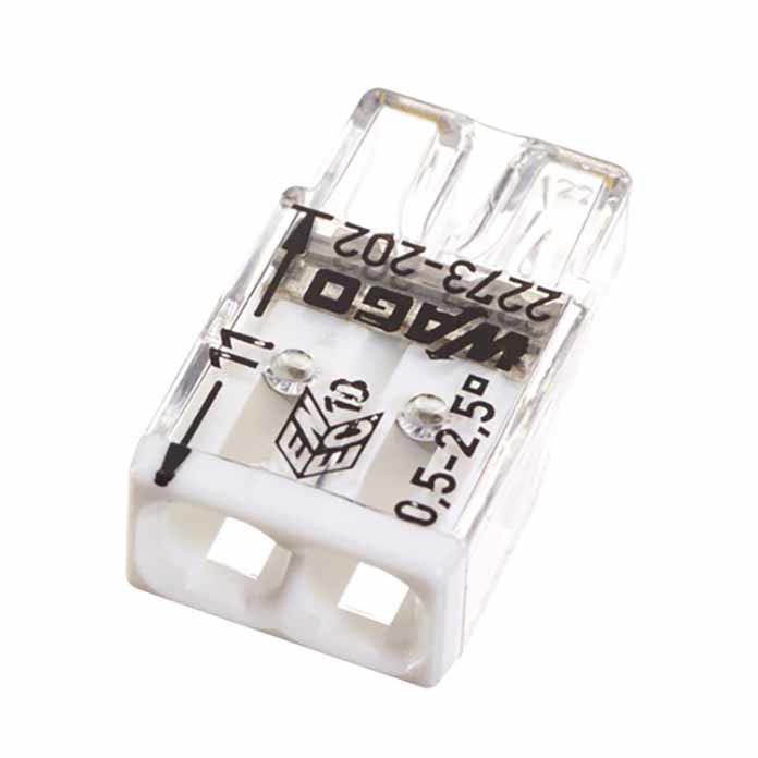 WAGO 2273-202 je 2-polna instalaciona klema (spojnica) sa PUSH WIRE® tehnologijom (push-in) za brzo povezivanje provodnika u elektro-instalacijama. Namenjena je prvenstveno za pune bakarne provodnike, a može se koristiti i za pune aluminijumske provodnike uz preporučenu upotrebu WAGO “Alu-Plus” kontaktne paste 249-130 (uz čišćenje provodnika pre ugradnje).